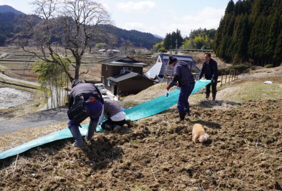 こんにちは、営業部の塩垣です!今回は果樹園作り第2段🍎防草シート貼りとフェンス作りの様子をお届けします!まずは防草シート貼り。防草シートは太陽光を遮断し、雑草の成長を妨げる役割をしてくれます。これを果樹園となる敷地の外周にぐるりと貼ってきました。作業自体はシートを敷いてピンで固定するだけと簡単。ですが、広大な敷地に加え作業日はあいにくの強風……。敷いた先からシートが飛んでしまうため、5人でシートを抑えながら必死に固定していきました。やっとのことで防草シートを貼り終わったらお次はフェンス!植えた作物が動物に食べられないよう、荒らされないようにフェンスを建てました🦌先ほど貼った防草シートの上から、社長お手製の道具で杭を打っていきます。間隔はだいたい2m50㎝。こちらもぐるりと1周建てました。そして杭が打ち終わったらネットの取付。杭に引っ掛ける場所があるので、そこにハンマーを使って固定していきました。こちらも作業内容的には難しくないのですが、いかんせん全てが重い!男性陣が率先してやってくれたのですが、杭もネットも重量があり体力の消費が激しそうでした……。次回はようやく果物を植えていきます!お楽しみに!