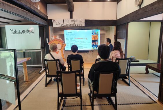 こんにちは、営業部の塩垣です!5月18日に行われた第25回Yoshitake村御杖『内覧会&古民家物件探索ツアー』が無事終了いたしました!17日も開催予定だったのですが、キャンセルが相次ぎ1名様だけに……。お1人に対し社員複数人は気まずくないかなと思い、18日をご提案させていただき、皆様18日に来ていただきました!今回は計3組、4名の方にお越しいただきました。 イベント内容は前回と変わらず、最初に最新型古民家モデルルームの内覧。GW中に作られた吉武ファームも見ていただきました♪そして、古民家鑑定士1級の資格を持つ弊社代表による古民家セミナー。実は前回のセミナーから少し資料のアップデートを行った為、より伝わりやすくなったのではないかと思います。 セミナーが終われば探索ツアーへ出かけます。今回はなんと探索ツアー中、清掃に訪れていた物件の売主さんと遭遇! その場でプチセミナーが開催されました。物件の前で記念にパシャり📷その家の事や、村の特徴など。長年住んでいたからこそわかる情報を教えていただき、私たちも大変為になる時間を過ごさせていただきました。最後はお茶を飲みながら座談会を行います。セミナーやツアーを通じて気になったことや、それぞれの夢など。たくさんお話を聞かせていただきました。最後はドローンを使って記念撮影も!ドローンが登場した瞬間、その日一番の盛り上がりを見せていました😂周りの家の事を気にせずドローンを飛ばすことができるのも、田舎ならではの特徴かもしれませんね。次回は6/23(日)開催予定です。なんと初の日曜日開催!定員になりますと、満員御礼で募集を締め切らせていただくことがありますので、ご参加希望の方は、イベントの告知が開始しましたら早めのご予約をお願いいたします。また、7月6日にはYoshitake村御杖の完成1周年を記念したイベントを行います!両イベントとも、HPや各種SNSにて告知してまいりますので、ぜひご確認ください。皆様にお会いできます事、楽しみにお待ちしております!