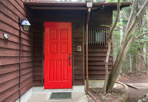 赤が印象的な玄関ドア。 外観のアクセントにもなっておりロッジの雰囲気を一層引き立ててくれます。